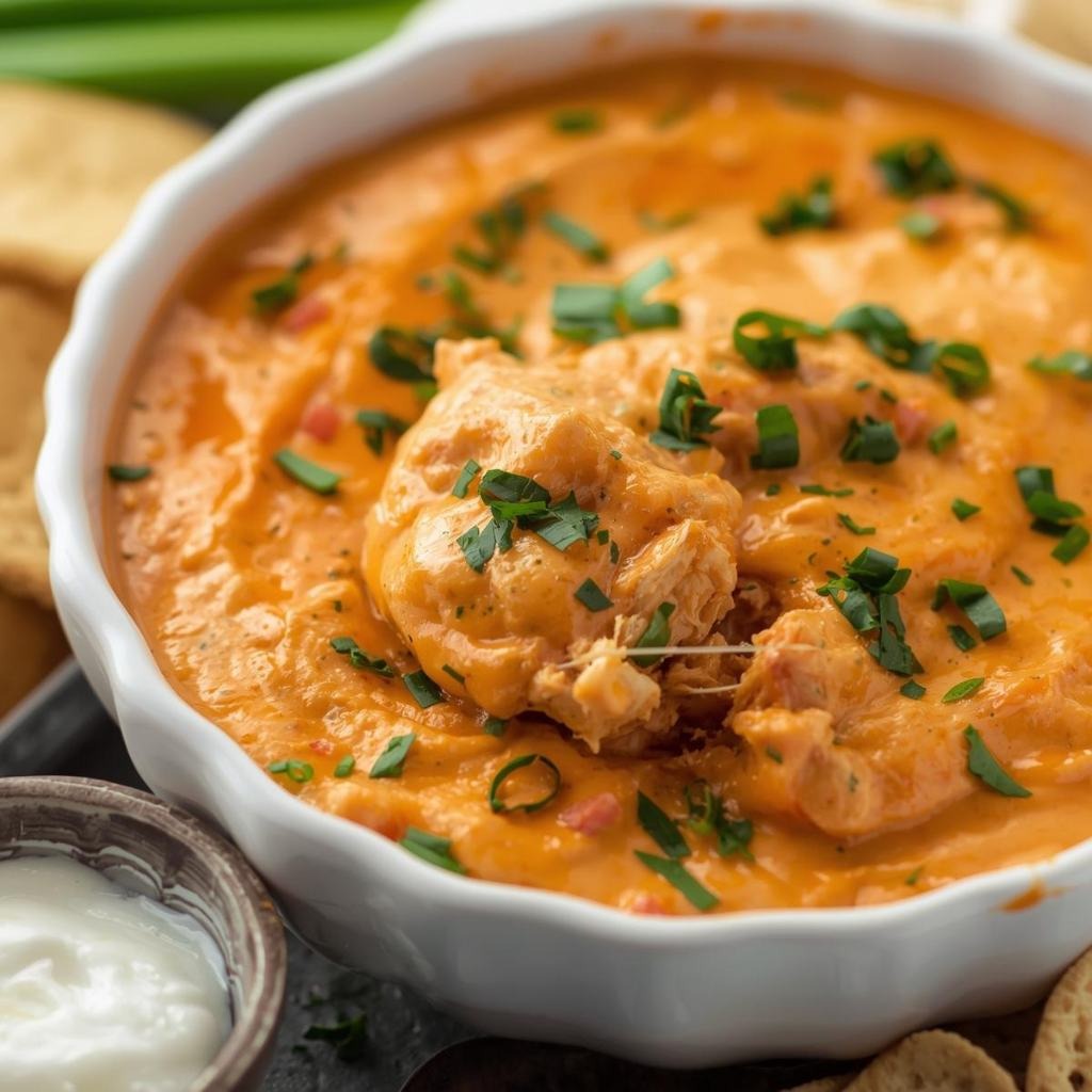 • 2.5 cups cooked shredded chicken (rotisserie or home-cooked) • 8 ounces cream cheese, softened to room temperature • 1/2 cup buffalo sauce (Frank’s RedHot or similar brand) • 1/2 cup ranch dressing or Greek yogurt mixed with ranch seasoning • 1 cup shredded cheddar cheese • 1/2 cup shredded mozzarella cheese • 1/4 cup grated Parmesan cheese • 2 tablespoons butter • 2 cloves garlic, minced • 1/2 teaspoon salt • 1/4 teaspoon black pepper • 1/4 teaspoon cayenne pepper (optional, for extra heat) • 1 tablespoon lemon juice • 2 tablespoons fresh parsley, chopped • 2 tablespoons green onions, sliced • 1/2 cup panko breadcrumbs (optional, for topping) • 2 tablespoons melted butter (optional, for breadcrumb topping) • Celery sticks, carrot sticks, and crackers for serving • Blue cheese crumbles for garnish (optional)