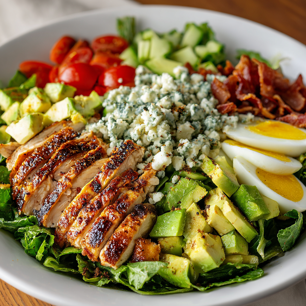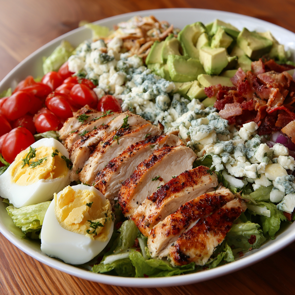 Chicken Cobb Salad represents the ultimate composed salad that celebrates fresh ingredients, hearty proteins, and a zesty vinaigrette in a beautifully arranged presentation that feels both casual and elegantly sophisticated. This iconic dish combines crisp lettuces with tender grilled chicken, crispy bacon, creamy avocado, hard-boiled eggs, and tangy blue cheese, creating layers of flavor and texture that make every bite interesting and genuinely delicious. What makes this recipe truly special is its remarkable ability to deliver a complete, satisfying meal that feels indulgent and wholesome simultaneously, satisfying every craving while nourishing your body. The combination of colorful, nutritious ingredients arranged in attractive rows creates visual appeal that makes this salad as beautiful to look at as it is wonderful to eat. Whether you’re preparing a light lunch for yourself, feeding a family with diverse tastes, or impressing guests at a casual gathering, Chicken Cobb Salad delivers consistent, restaurant-quality results that feel far more complicated than the straightforward preparation requires. This dish proves that impressive, memorable meals don’t require complicated techniques when you combine quality ingredients with proper assembly and presentation.