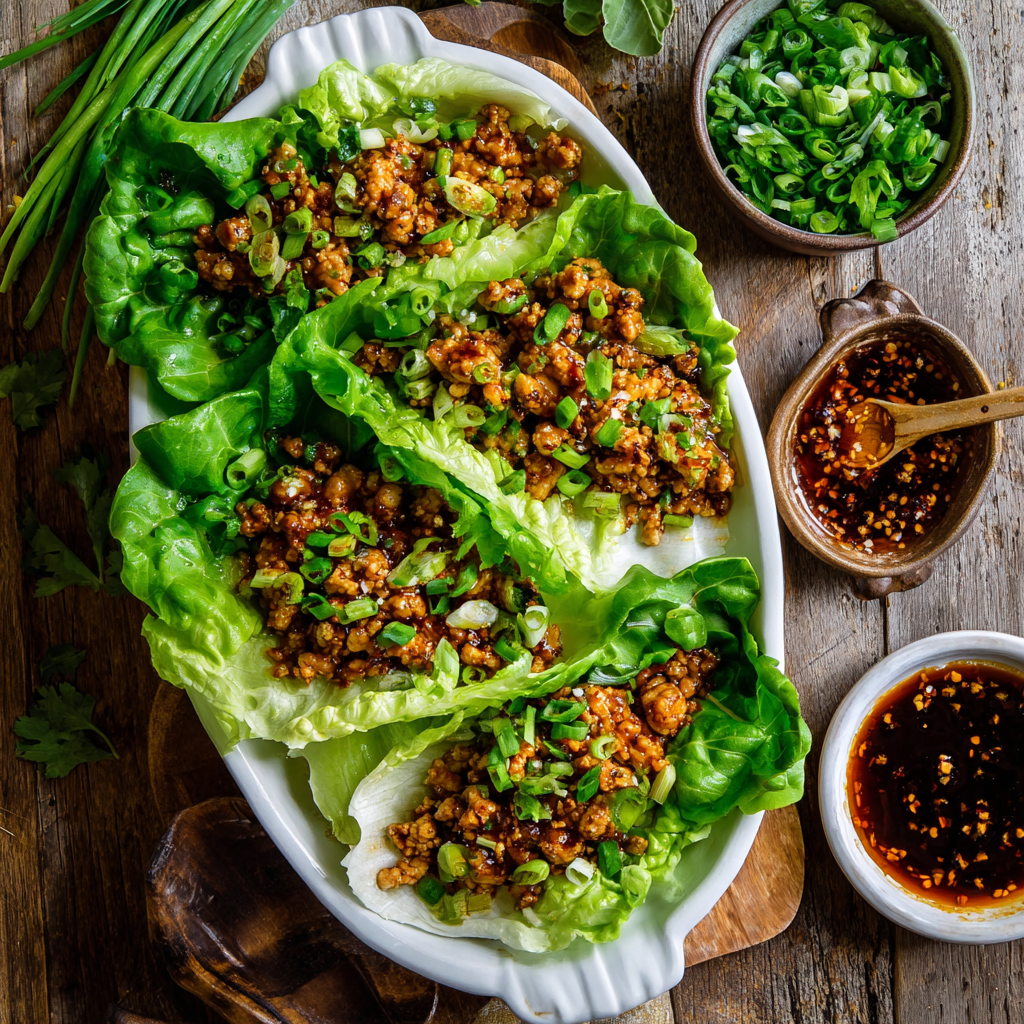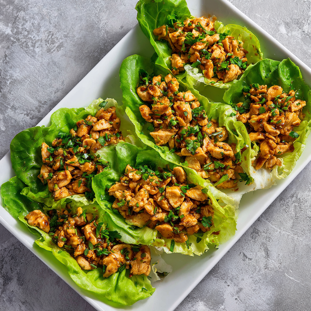 • 1.5 pounds ground chicken (or finely diced cooked chicken breast) • 8 large butter lettuce or iceberg lettuce leaves • 3 tablespoons soy sauce • 1 tablespoon sesame oil • 1 tablespoon rice vinegar • 2 cloves garlic, minced • 1 tablespoon fresh ginger, minced • 1 medium carrot, finely diced • 1/2 cup diced water chestnuts • 3 green onions, chopped • 1/4 cup diced red bell pepper • 1 teaspoon cornstarch mixed with 2 tablespoons water • 1 tablespoon olive oil • 1/4 teaspoon red pepper flakes (optional) • Salt and pepper to taste • Optional toppings: cilantro, hoisin sauce, sriracha, cashews, or crispy fried onions