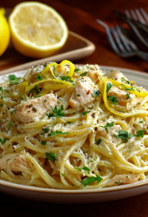 Bring the sauce to a gentle simmer over medium heat and cook, stirring occasionally, for approximately fifteen to twenty minutes. The sauce should reduce slightly and develop deeper, more concentrated flavors. Taste and adjust seasoning with additional salt, pepper, or lemon juice as needed—the acid from the lemon brightens the sauce without requiring more salt. Remember that you’ll be adding the chicken on top, which is salty, so season conservatively.