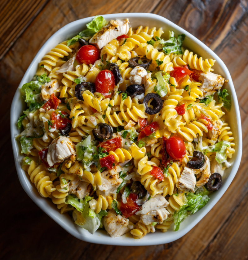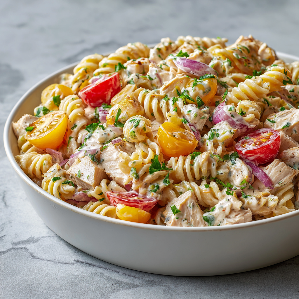 Chicken Pasta Salad represents the ultimate make-ahead dish that celebrates fresh vegetables, tender pasta, and succulent grilled chicken in a creamy, tangy dressing that actually improves with time as flavors meld and deepen. This versatile crowd-pleaser combines perfectly cooked pasta with protein-rich chicken, crisp vegetables, and a homemade dressing that tastes infinitely superior to store-bought versions, creating something genuinely memorable and satisfying. What makes this recipe truly special is its remarkable ability to deliver a complete, impressive meal that works equally well for casual family picnics, elegant outdoor entertaining, or convenient lunch prep for busy weekdays. The combination of fresh ingredients bound together in creamy dressing creates layers of flavor that develop beautifully as the salad sits, making it ideal for preparing ahead and serving at room temperature. Whether you’re planning a backyard gathering, packing lunches for the week, or seeking a satisfying main course that doesn’t require last-minute cooking, Chicken Pasta Salad delivers consistent, delicious results that leave everyone satisfied and requesting the recipe. This dish proves that make-ahead meals can be genuinely exciting and crave-worthy when you combine quality ingredients with proper technique and care.