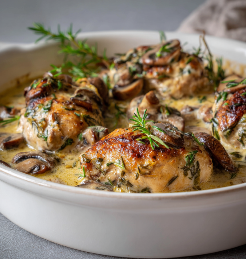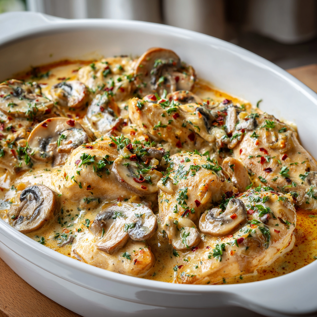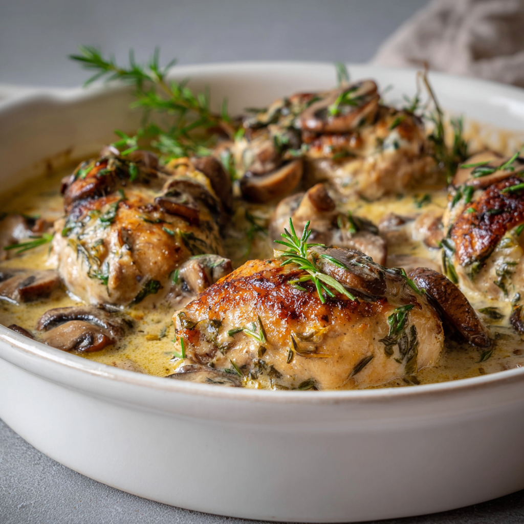 • 1.5 pounds boneless, skinless chicken breasts or thighs • 4 tablespoons unsalted butter, divided • 2 tablespoons olive oil • 1 pound mushrooms (cremini, button, or portobello), sliced • 1 medium yellow onion, diced • 5 cloves fresh garlic, minced • 1 cup chicken broth • 1 cup heavy cream • 1/2 cup sour cream or Greek yogurt • 1/2 cup dry white wine or additional chicken broth • 1/2 cup grated Parmesan cheese • 1/4 cup cream cheese (optional, for extra creaminess) • 1 teaspoon kosher salt • 1/2 teaspoon black pepper • 1/2 teaspoon garlic powder • 1/4 teaspoon white pepper (optional, for smoother flavor) • 1/2 teaspoon Italian seasoning • 1/4 teaspoon thyme (fresh or dried) • 1/4 teaspoon nutmeg (just a pinch) • 1/4 teaspoon red pepper flakes (optional) • 2 bay leaves • 1 tablespoon fresh lemon juice • 1 teaspoon Dijon mustard • 1 tablespoon cornstarch mixed with 2 tablespoons water (optional, for thickening) • 3 tablespoons fresh parsley, finely chopped • 2 tablespoons fresh chives, finely chopped (optional) • 1 teaspoon fresh thyme leaves for garnish • Zest of 1 lemon