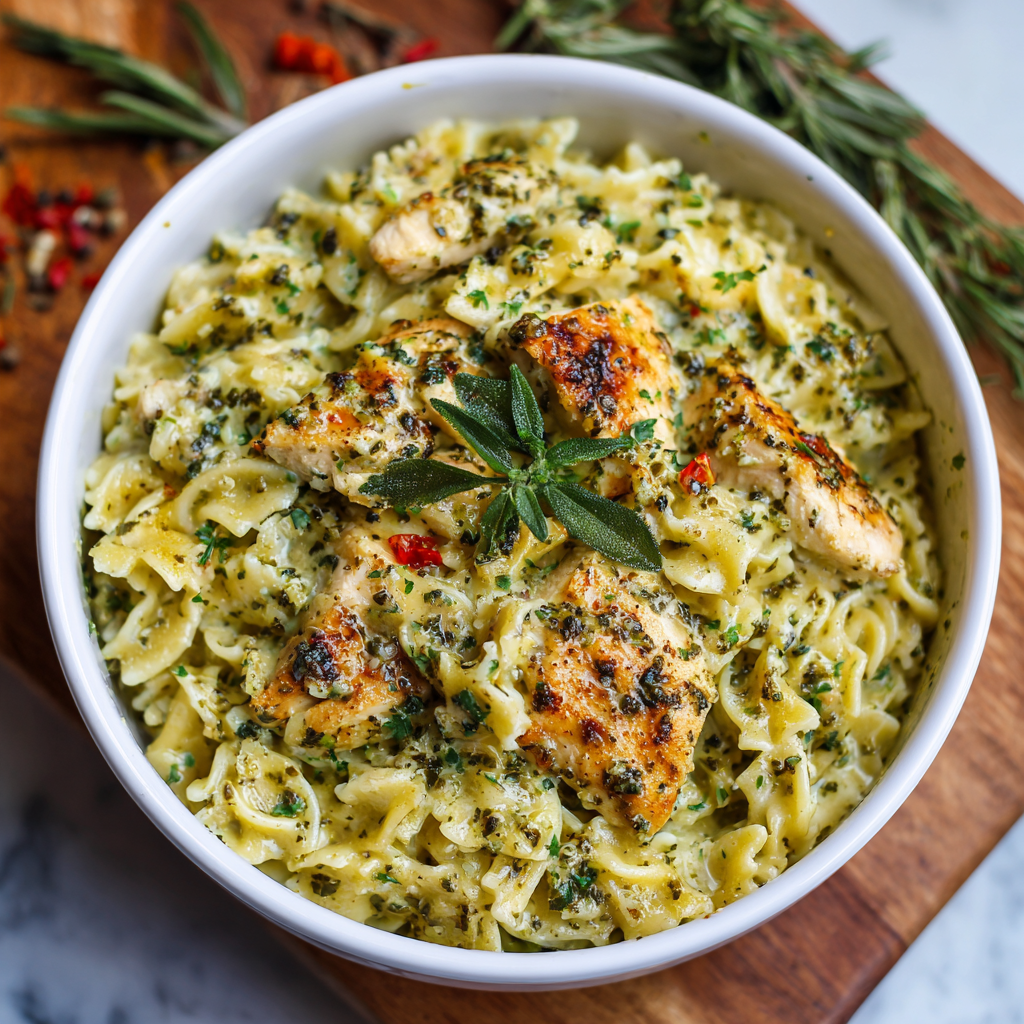 • 1.5 pounds boneless, skinless chicken breasts • 1 pound pasta (penne, rigatoni, or fettuccine work beautifully) • 3 tablespoons olive oil, divided • 4 tablespoons butter • 1 medium yellow onion, thinly sliced • 4 cloves garlic, minced • 3/4 cup chicken broth • 1/2 cup heavy cream • 1/2 cup whole milk • 1/2 cup reserved pasta water • 1 teaspoon salt • 1/2 teaspoon black pepper • 1/4 teaspoon white pepper (optional) • 1/2 cup homemade pesto (or high-quality store-bought) • 1/3 cup grated Parmesan cheese • 2 tablespoons pine nuts (optional, for garnish) • 2 tablespoons fresh basil, chopped (optional garnish) • 1/4 cup sun-dried tomatoes, chopped (optional, for brightness)