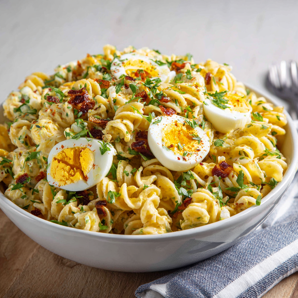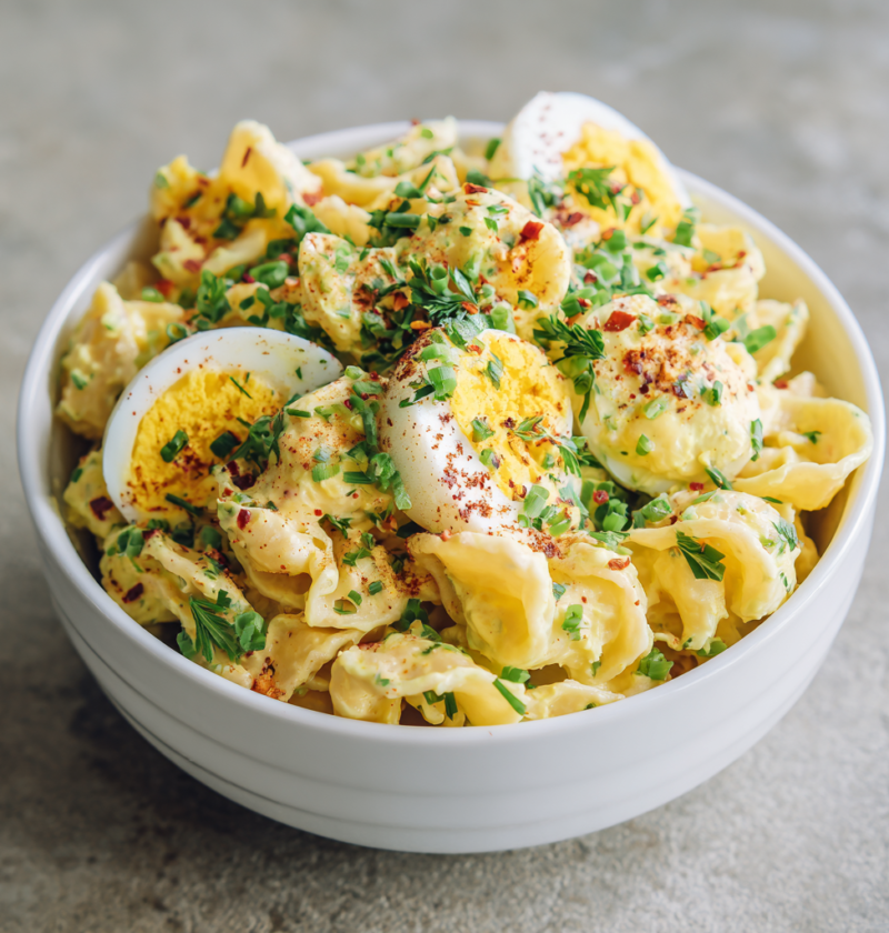 Deviled Egg Pasta Salad brings together the beloved, nostalgic flavors of classic deviled eggs combined with tender pasta, fresh vegetables, and a creamy, tangy dressing that creates something genuinely exciting and crave-worthy. This creative fusion dish celebrates the timeless appeal of deviled eggs while offering the convenience and practicality of a cold, make-ahead salad that works beautifully for gatherings, picnics, and weekday meal prep. What makes this recipe truly special is its remarkable ability to capture the quintessential deviled egg experience—with savory mustard, tangy vinegar, and creamy richness—while expanding those beloved flavors into an entirely new and satisfying form. The combination of perfectly cooked eggs, tender pasta, fresh vegetables, and distinctive dressing creates layers of flavor that make every bite interesting and absolutely delicious. Whether you’re planning a backyard gathering, bringing a dish to potlucks, or seeking a satisfying main course that brings genuine smiles to everyone’s faces, Deviled Egg Pasta Salad delivers consistent, impressive results that exceed expectations every single time. This dish proves that creative takes on classics can be genuinely exciting and memorable when you respect the original’s appeal while bringing fresh perspective and proper technique.