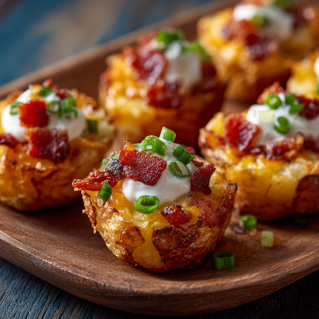 Serve your loaded potato bites hot directly from the oven for maximum crispiness and optimal cheese melting. First, present bites on wooden boards, ceramic platters, or tiered stands that showcase them attractively while making grabbing easy. Additionally, setting up a condiment station with extra sour cream, bacon bits, and fresh herbs allows guests to customize their bites according to personal preferences. Meanwhile, these potato bites work beautifully as gameday food, tailgate offerings, casual entertaining, appetizers, or even main courses because their handheld nature suits informal settings perfectly.