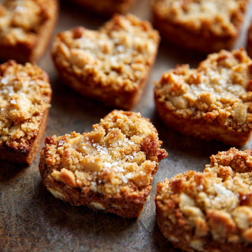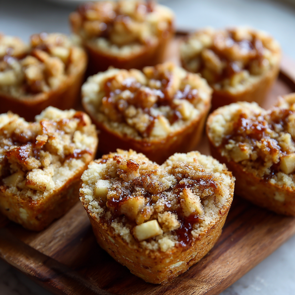 To preserve these heart-shaped minis at peak flavor and texture, allow them to cool completely before storing in an airtight container. Layer minis with parchment paper between them to prevent sticking and maintain individual integrity. Properly stored, these apple crumble minis stay fresh and delicious for up to 4 days at room temperature in an airtight container, maintaining their crispy crumble topping and tender apple filling. For extended storage, refrigerate the minis in a covered container for up to 5 days, though the crumble topping may soften slightly in the humidity of the refrigerator. For longer-term storage, freeze the completely cooled minis in a freezer-safe container or freezer bag for up to 3 months—thaw them at room temperature for about 1 hour before serving, or reheat gently in a 300°F oven for 8-10 minutes to restore crispiness to the topping. To reheat refrigerated or room-temperature minis and restore the crumble’s crispiness, warm them in a 325°F oven for 5-8 minutes until heated through and the topping becomes crispy again. Alternatively, microwave individual minis for 30-45 seconds until warm, though this softens the crumble topping more than oven reheating. Do not store these minis in plastic bags or covered containers at room temperature, as trapped moisture will soften the crumble topping. For gift-giving, wrap individual minis in cellophane or tissue paper and store in a cool location; refrigerate during transport and storage in warm weather. The apple filling can be made a day ahead and stored in the refrigerator, then combined with fresh crumble topping before baking for convenience.