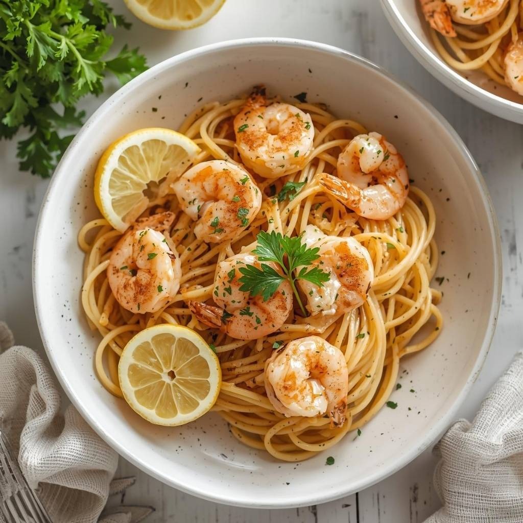 Divide the lemon shrimp pasta evenly among individual serving bowls or shallow plates, creating an attractive presentation that showcases the shrimp. Top each serving with additional fresh parsley, dill, and a light shower of parmesan cheese for visual appeal and flavor. Furthermore, add any optional toppings you desire, such as crispy pancetta for smokiness, caramelized garlic chips for sweetness, thin lemon slices for garnish, fresh microgreens for elegance, toasted breadcrumbs for crunch, or additional fresh herbs for brightness. These finishing touches elevate the dish into something truly restaurant-quality and impressive.