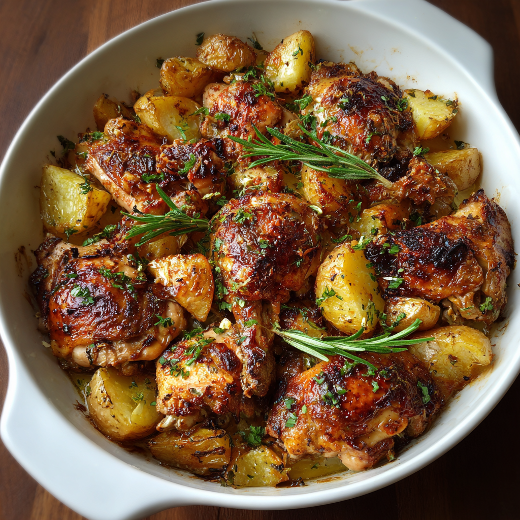 • 4 bone-in, skin-on chicken thighs or breasts (about 2.5 pounds total) • 1.5 pounds baby potatoes, halved • 1 medium yellow onion, cut into wedges • 4 cloves fresh garlic, minced • 3 tablespoons olive oil • 2 tablespoons unsalted butter • 1 teaspoon kosher salt • 1/2 teaspoon black pepper • 1 teaspoon garlic powder • 1 teaspoon Italian seasoning • 1/2 teaspoon paprika • 1/4 teaspoon red pepper flakes (optional) • 1 cup chicken broth • 1/2 cup dry white wine or additional chicken broth • 2 tablespoons fresh lemon juice • 1 teaspoon fresh thyme leaves (or 1/2 teaspoon dried) • 1 teaspoon fresh rosemary leaves (or 1/2 teaspoon dried) • 3 tablespoons fresh parsley, finely chopped • Zest of 1 lemon