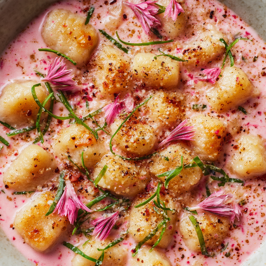 - Divide the pink Alfredo gnocchi between serving bowls, spooning extra sauce generously over each portion.
