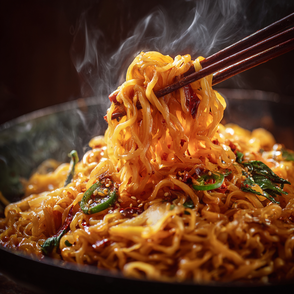 Keep leftover spicy noodles in an airtight container in the refrigerator for up to 2 days, storing them with the sauce so the noodles remain moist and flavorful. To reheat, place the noodles in a skillet over medium heat with a splash of water or broth, stirring frequently for 3 to 5 minutes until heated through evenly. Alternatively, you can reheat in the microwave in a microwave-safe bowl covered loosely with a damp paper towel, stirring every minute until heated through completely. The spicy noodles are less ideal when cold or reheated compared to fresh from the pan, though they remain quite delicious and are perfect for quick lunch assembly. For longer storage, you can freeze the cooked noodles and sauce together in a freezer-safe container for up to 2 months, though the texture of the noodles may change slightly upon thawing.