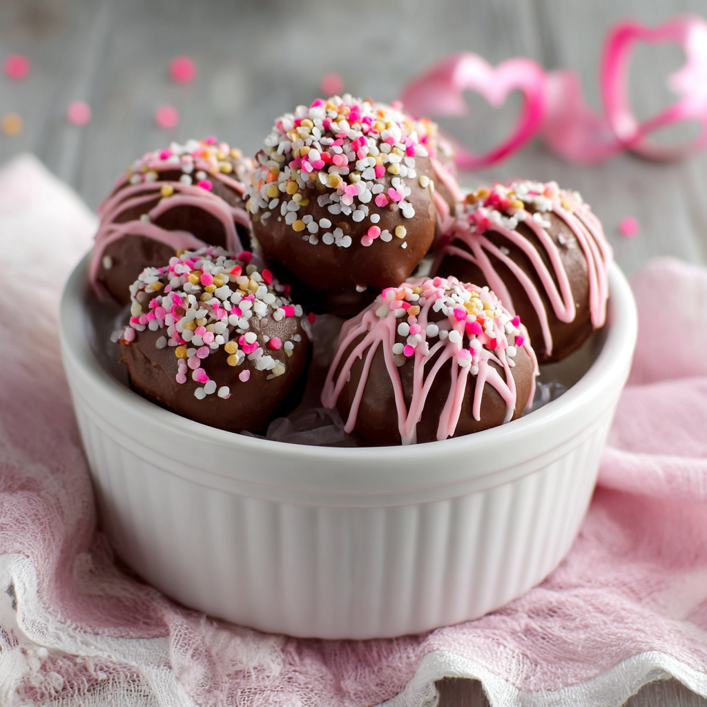 • 2 ounces white chocolate, melted (optional) • Red sprinkles or edible glitter • Cocoa powder for dusting • Heart-shaped candies or decorative elements (optional)