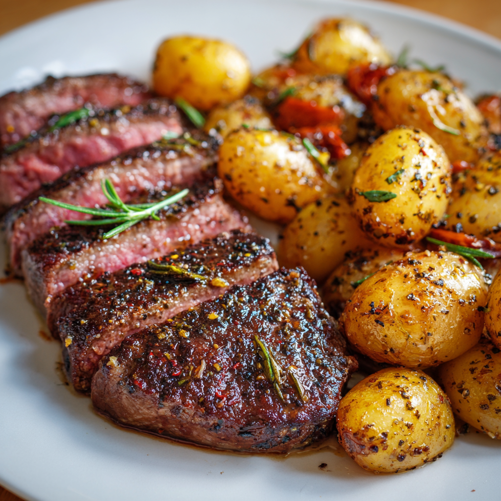 Can I prepare both the steaks and potatoes completely ahead and reheat them? You can prepare potatoes ahead, but steaks are best seared fresh just before serving; reheat potatoes gently while searing steaks fresh for optimal quality.