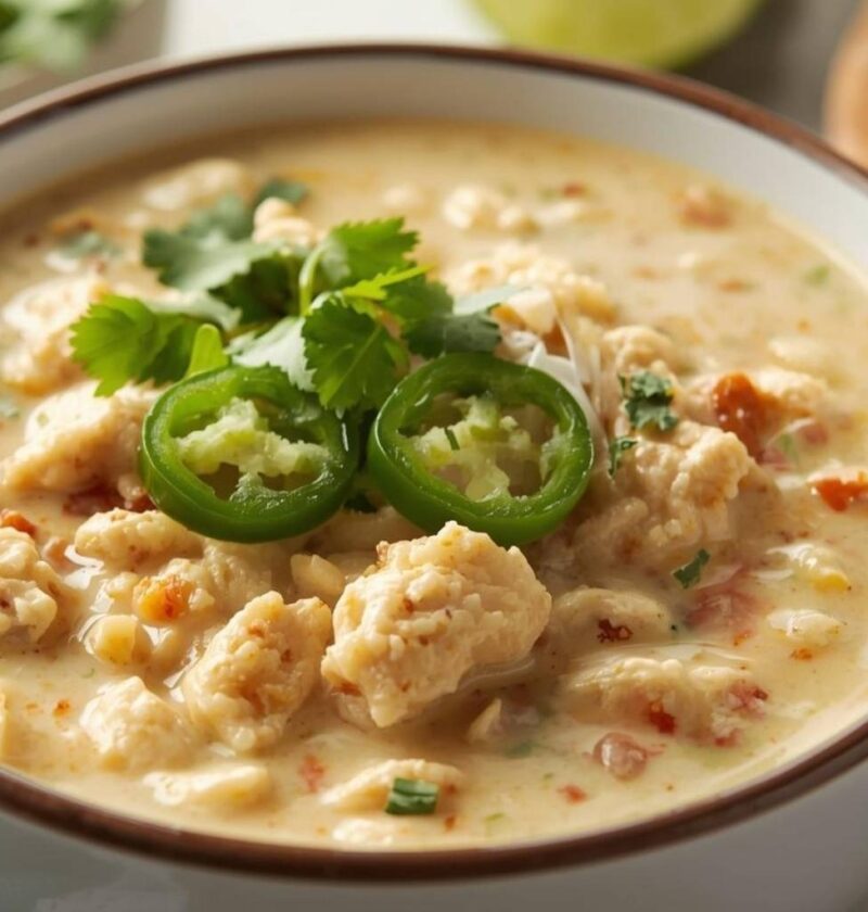Remove the pot from heat and ladle the white chili into deep bowls, serving it while it’s hot and the cheese is perfectly melted. Top each serving generously with your choice of toppings: sliced jalapeños for additional heat, fresh cilantro for brightness and herbaceous notes, a squeeze of lime juice for acidity that balances richness, tortilla strips for satisfying crunch, sliced green onions for sharpness, creamy avocado slices for richness, or crumbled queso fresco for authentic texture. The beauty of chili lies in how you can customize each bowl to suit individual preferences and tastes.