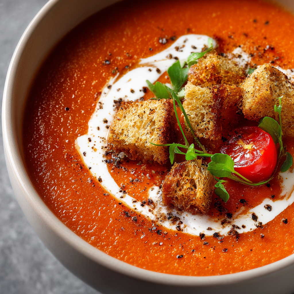 When winter winds blow cold and you need something warm and soothing, nothing comforts quite like a bowl of velvety tomato soup that tastes like liquid sunshine on the dreariest days. This classic comfort food combines rich tomato flavor with luxurious creaminess into a soul-warming dish that feels like a hug in a bowl. What makes this recipe truly exceptional is how it achieves restaurant-quality depth and smoothness using simple ingredients and straightforward techniques that anyone can master in their own kitchen. The combination of roasted tomatoes, aromatic vegetables, fresh herbs, and just the right amount of cream creates layers of flavor that make this soup genuinely crave-worthy rather than just something you eat because it’s healthy. Whether you’re pairing it with grilled cheese sandwiches for the ultimate nostalgic meal, serving it as an elegant first course, or simply enjoying a cozy solo dinner, this tomato soup delivers satisfaction and warmth that makes everything feel better. Best of all, it comes together in about forty-five minutes, makes generous portions perfect for meal prep, and actually tastes even better the next day as the flavors continue melding together.